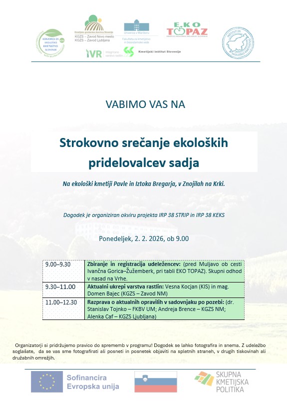 V ponedeljek, 2. februarja 2026, ob 9.00, se bomo srečali na ekološki kmetiji Pavle in Iztoka Bregarja v Znojilah na Krki, kjer bomo skupaj razpravljali o aktualnih izzivih in ukrepih varstva rastlin v ekološkem sadjarstvu.