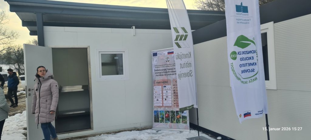 Udeleženci so si ogledali Center za jagodičje Kmetijskega inštituta Slovenije v Slivnici pri Mariboru, kjer je bil predstavljen nov hladilni kontejner za proučevanje skladiščenja jagodičja.