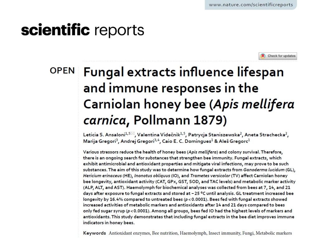 Naši raziskovalci so objavili novo študijo v reviji Scientific Reports, v kateri so ocenili vpliv hranjenja čebel kranjske sivke z glivnimi izvlečki na njihovo preživetje in imunski odziv. Rezultati so izjemno obetavni in kažejo, da bi lahko tovrstni izvlečki služili kot učinkovit dodatek za krepitev imunskega sistema medonosnih čebel.