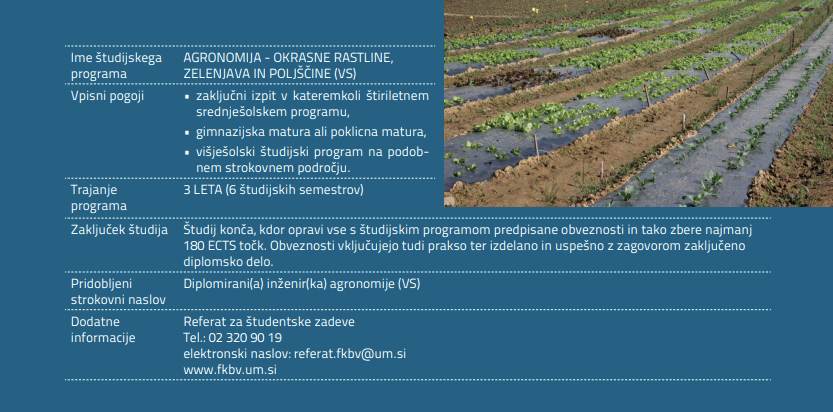 Visokošolski strokovni študijski program Agronomija – okrasne rastline, zelenjava in poljščine je usmerjen v spoznavanje sodobnih, okoljsko sprejemljivih tehnik pridelovanja okrasnih rastlin, zelenjave, poljščin in krmnih rastlin.