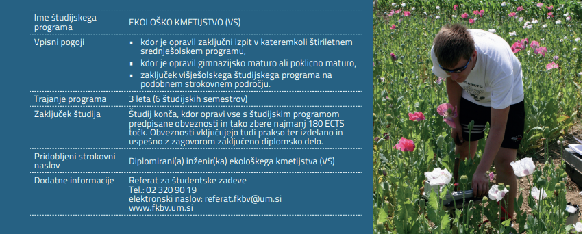 S študijskim programom »Ekološko kmetijstvo« bodo študenti usposobljeni za uspešno delo in prilagajanje novim potrebam in trendom v kmetijstvu, kjer je vse večji poudarek na trajnostnemu razvoju, uvajanju okolju in potrošnikom prijaznejše pridelave hrane, ohranjanju biotske raznovrstnosti, poseljenosti podeželja, iskanju novih tržnih priložnosti, povezavi kmetijstva s turizmom… Ekološko kmetijstvo je v primerjavi z ostalimi oblikami kmetijstva še posebej raznovrstno in temelji na krogotoku snovi in energije v sistemu tla – rastline – živali – človek. Ekološki pridelki in živila pa so vrhunske kakovosti in zlasti notranje kakovosti, kar jim daje še posebno vrednost, ki jo priznava tudi tržišče.